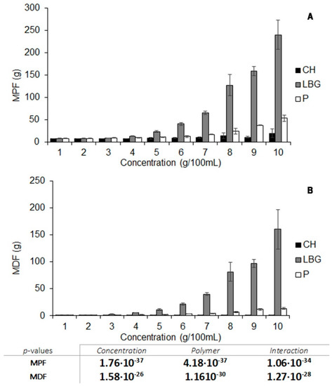 MPF and MDF values for the three polymers in SVF are shown in Figure 1A,B, respectively. All the polymer gels revealed increasing values of MPF when the concentration of polymer was higher than 4 g/100 mL SVF, thus indicating that polymers jellify at this concentration or higher. MDF values also increased for LBG and P when the polymer concentration was over 4 g/100 mL, but remained constant for CH systems. CH was unable to generate a homogeneous gel in SVF as this medium does not meet the requirements; it has insufficient acidity to imbibe the polymer chains [18]. Nevertheless, it is sufficiently acid to break the bonds between the CH chains, and the imperfect gelation of the polymer produces a flocculation process in the medium, leading to a heterogeneous system with a higher flocculate height the greater the concentration of the polymer. When the amount of polymer was above 5 g/100 mL, a higher MDP was required to penetrate the flocculate, however, the three-dimensional system was unable to attach to the probe, hence the constant MDF values for all the CH systems. LBG can be said to generate the most consistent gel, and has the highest penetration and detachment rates. Gels are also obtained for P, but show lower consistencies, as can be seen from the texture analysis curves. These results indicate that LBG forms a much stronger gel in the medium than P.