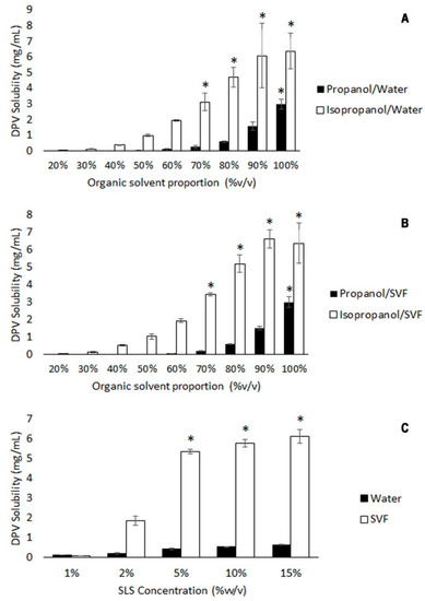 Dapivirine (DPV) solubility in isopropanol/propanol and water mixtures (A), isopropanol/propanol and simulated vaginal fluid (SVF) mixtures (B) and sodium lauryl sulphate/simulated vaginal fluid (SLS/SVF) and sodium lauryl sulphate/water (SLS/water) solutions (C) performed in triplicate. An asterisk on the bar indicates that the result is significantly greater than the solubility required for the study (α = 0.05).
