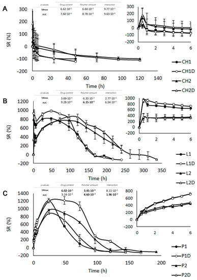 Swelling behaviour profiles in simulated vaginal fluid (SVF) for chitosan (A), locust bean gum (B) and pectin (C) batches evaluated in triplicate. The first six hours are shown in detail in the graphics in the bottom right corner. p-Values obtained for SRmax and AUC through two-way ANOVA processing are included in the graphics with polymer amount and drug content as factors (α = 0.05). The bold font indicates significant differences.