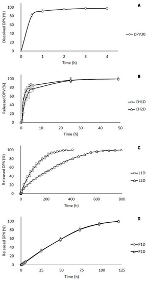 The dissolution process of pure micronized DPV was assessed in mSVF (Figure 4A) and revealed the almost complete dissolution of the drug (93%) over a period of 4 h. DPV release profiles from polymer systems are different, and a controlled release was obtained in all cases, although the release profile clearly varies depending on the polymer used. Differences were observed in the drug release between CH batches (CH1D and CH2D) during the first six hours, but the rapid erosion of the tablets led to a quick and complete DPV release in the first 24 h for both batches (Figure 4B).