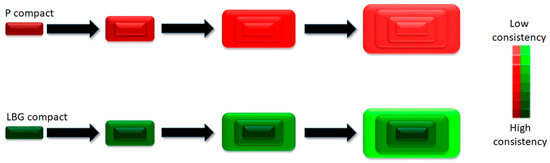 Drug release data are related to texture behaviour: the consistency acquired by P tablets in contact with SVF is not dependent on the amount of P. The opposite occurs in the case of LBG, so an increase in the amount of polymer reduces the amount of drug released. This can be explained by the fact that gel texture analyses (Section 3.1.1) revealed that an increase in P concentration slightly increased the consistency parameters (MPF and MDF), in contrast with LBG-based gels. The consistency of the swelled P tablets is therefore homogeneous, while in LBG-based tablets it is heterogeneous and greater at the deepest layers (Figure 5), hence the differences between the release profiles for the L batches and the homogeneity between P batches.
