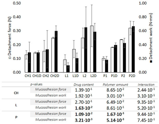 Statistical processing indicates that there cannot be said to be any statistically significant differences between CH batches in terms of either the amount of polymer or the presence of the drug. The same is true of L batches, due to the high variability in the bioadhesion values for L or CH batches, indicating that these systems may have a somewhat erratic adhesion to the area of action. However, there are significant differences in both factors in the case of P batches, where the variability between the samples is low in all cases; this implies that the adhesion of the tablets could be highly reproducible, so P can be considered a promising candidate for the development of mucoadhesive dosage forms [45]. No significant interaction was observed between the presence of drug and the amount of polymer in any of the batches, indicating that the drug’s contribution to the bioadhesion capacity is not conditioned by the amount of polymer.