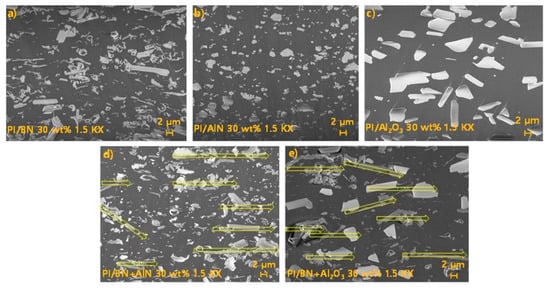 FE-SEM (field emission scanning electron microscopy) images of the cross-sectional fracture surfaces of the composite films containing (a) 30 wt % of PI/BN (boron nitride); (b) 30 wt % of PI/AlN (aluminum nitride); (c) 30 wt % of PI/Al2O3; (d) 30 wt % of PI/BN+AlN (1:1); and (e) 30 wt % of PI/BN+Al2O3 (1:1) (the arrow mark meaning the effective thermal pathway originated from the connection of thermal conductive fillers).