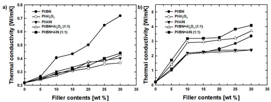 Among these materials, BN seems the most promising, owing to its high thermal conductivity (up to 400 W/m∙K) and relatively low dielectric constant (approximately four), compared with those of other ceramic fillers. Moreover, the thermal conductivity of BN depends on the orientation direction (i.e., is anisotropic), thereby leading to a high versatility of BN in product design [9,10]. Thermally conductive composites containing ceramic fillers in epoxy [2], high-density polyethylene (HDPE) [11], linear low-density polyethylene (LLDPE) [12], polystyrene (PS) [13], and polyamide (PA) [6] have been previously reported. Recently, polyimide (PI)-based composite materials with outstanding properties (high chemical resistance, high mechanical strength, high thermal stability, and low dielectric constants) have been widely applied to packaging and insulating materials in the microelectronics and aerospace industries. Unfortunately, high concentrations of conducting filler in these materials hinder the use of the composites in various applications, owing to the loss of polymeric material [6,7]. Several studies have considered binary filler systems for polymer composites. Che et al. fabricated high-density polyethylene/boron nitride/carbon nanotubes (CNTs) via melt-mixing and subsequent hot rolling and reported that as the content of BN increases, BN forms an effective network with CNTs in the matrix [14]. Bian et al. prepared dopamine modified binary filler, micro-sized BN, and nano-sized Al2O3 for epoxy composites. They confirmed that BN mainly built the heat conduction network and Al2O3 formed a bridge between the BN particles [14]. Chen et al. [15] fabricated epoxy composites with two types of spherical Al2O3 to control the viscosity and thereby improve the processability; these composites exhibited high thermal conductivity. Furthermore, Choi et al. [16] prepared Al2O3 and AlN of different sizes with the aim of improving the packaging loading of fillers, and the resulting composites yielded high thermal conductivity.