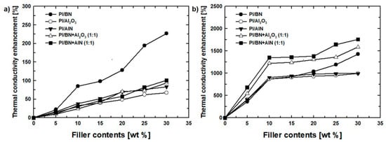 Figure 2a,b show the values of thermal conductivity calculated along the through-plane and in-plane directions, respectively, of the obtained films. Figure 3a,b show the corresponding enhancements of the conductivity along these orientations, with the highest values occurring along the in-plane direction of the films containing hybrid fillers. The maximum (4.091 W/m∙K) and minimum (2.404 W/m∙K) values of the thermal conductivity along the in-plane direction were observed for the samples with 30 wt % PI/BN+AlN and the sample with 30 wt % AlN, respectively. However, the conductivities along the through-plane direction were larger for the films containing only the BN filler than for the composites with hybrid fillers. A maximum value of 0.719 W/m∙K was observed for the sample with 30 wt % of BN and a minimum value of 0.368 W/m∙K occurred for the film containing a mixture of BN and Al2O3. The through-plane thermal conductivity results show that BN is a better thermally conductive filler than Al2O3 and AlN for the PI-based composite film. Therefore, the reduction in the BN content and addition of other filler leads to thermal conductivity degradation. However, compared with the Al2O3 and AlN composites, the hybrid filler system exhibited lower through-plane thermal conductivity, however higher in-plane thermal conductivity. These behaviors can be attributed to the interaction between the filler particles described in the previous section. The hybrid fillers lead to increased filler alignment along the in-plane direction, thereby obstructing the through-plane thermal pathways. As a result, added Al2O3 or AlN leads to increased interaction between the filler and an extra thermal pathway along the in-plane direction.