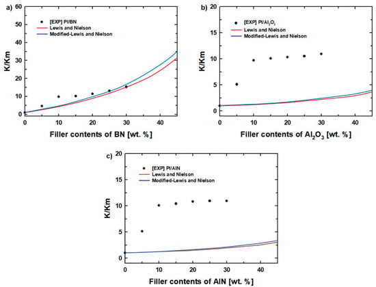 Experimental and theoretical thermal conductivity obtained using the regular and modified Lewis–Nielsen models for the (a) PI/BN; (b) PI/Al2O3; and (c) PI/AlN composite films.