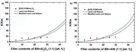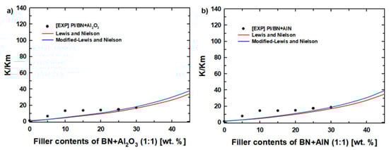 Here, is the predicted thermal conductivity of a hybrid filler composite, whereas and are the thermal conductivities of the composites with only the BN- and Al-containing fillers, respectively. The experimental results correspond closely to the theoretical predictions obtained via the additive approach method applied to the regular and modified Lewis–Nielsen models (see Figure 5). In the multiplicative approach method, the contribution of the BN filler to the thermal conductivity of a composite is calculated first and the obtained BN-containing composite is considered the matrix for the second Al2O3 or AlN filler. In other words, the contribution of the second filler to the thermal conductivity is calculated by using the PI/BN composite matrix () rather than the neat PI matrix (). The obtained contributions of both fillers are multiplied as follows [18,28],