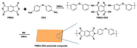 Analytical grade pyromellitic dianhydride (PMDA) and 4,4′-oxydianiline (ODA) were obtained from Daicel Chemical (Osaka, Japan) and Wakayama Seika Kogyo Co. Ltd. (Wakayama, Japan). N,N-dimethylacetamide (DMAc) solvent was purchased from J.T. Baker (Phillipsburg, NJ, USA). Preferentially, PMDA was purified by vacuum sublimation. The BN powder (with an average particle size of approximately 5 µm) was purchased from ChangSung (Seoul, Korea), while the Al2O3 (average particle size > 10 µm) and AlN (average particle size of approximately 10 µm) powders were acquired from Sigma Aldrich (St. Louis, MO, USA).