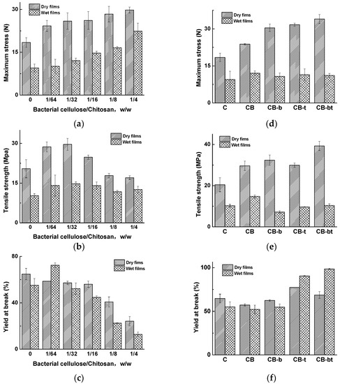 The impact of cross-linking treatment on the maximum strength, tensile strength, and yield at the break of dry and wet films of various ratios of bacterial cellulose/chitosan, chitosan (C), and 1/32 bacterial cellulose/chitosan (CB) treated with 4% borate (CB-b), 4% tripolyphosphate (CB-t), or a mixture of 2% borate and 2% tripolyphosphate (CB-bt). (a) maximum strength of Bacterial cellulose/Chitosan composite with varying weight ratio; (b) tensile strength of Bacterial cellulose/Chitosan composite with varying weight ratio; (c) yield at the break of Bacterial cellulose/Chitosan composite with varying weight ratio; (d) maximum strength 1/32 Bacterial cellulose/Chitosan composite with varying mode of cross linking; (e) tensile strength of 1/32 Bacterial cellulose/Chitosan composite with varying mode of cross linking; (f) yield at the break of 1/32 Bacterial cellulose/Chitosan composite with varying mode of cross linking.