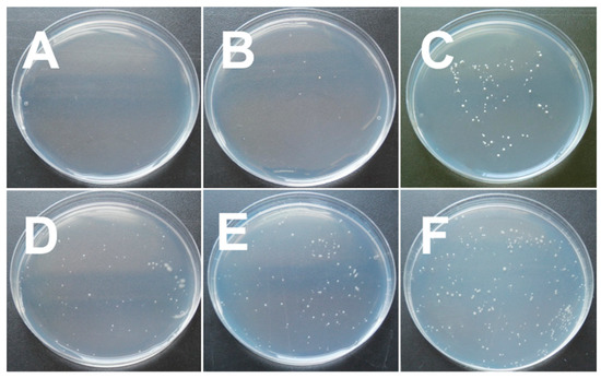 Images of antibacterial efficacy against S. cerevisiae for (A) C, (B) CB, (C) CB-b, (D) CB-t, (E) CB-bt, and (F) Blank (PE film).