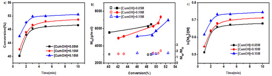 The aqueous cationic polymerization of IBVE was conducted in H2O using B(C6F5)3 combined with different concentrations of CumOH at 20 °C (Figure 3). Because B(C6F5)3 was dissolved in water, the polymerization sites in H2O were on the monomer/water surface. Figure 3 indicates that the IBVE polymerization rate increased slightly with increases in the concentration of CumOH. The highest monomer conversion was only 52% at [CumOH] = 0.15M (Figure 3a), which may be due to the chain-transfer reaction during polymerization. By contrast, the number average molecular weight (Mn) decreased as the concentration of CumOH increased (Figure 3b). The increase of Mn with monomer conversion at the later stage of polymerization was due to a coupling reaction during the later stages of the polymerization (see Section 3.6 for details). The polymers obtained in H2O exhibited broad MWDs, indicating that the suspension polymerization was not controlled. The nonlinear curves of ln([M0]/[M]) versus time (Figure 3c) illustrated that the number of active species in aqueous suspension processes decreased continuously with time.