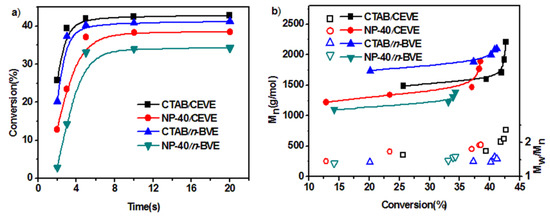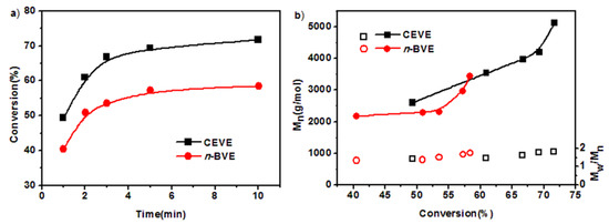 CEVE and n-BVE cationic polymerization initiated by CumOH/B(C6F5)3/Et2O in an emulsion at 20 °C: (a) conversion vs. time; (b) Mn and Mw/Mn vs. conversion; [CEVE] = 2.0 M; [n-BVE] = 1.6 M; [CumOH] = [B(C6F5)3] = 0.05 M; [Et2O] = 0.1 M; CTAB = 0.02 g; NP-40 = 0.02 g.