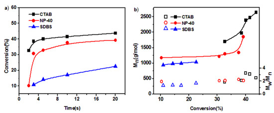 To better understand the influence of the aqueous environment on vinyl ether cationic polymerization, poly(IBVE), poly(CEVE), and poly(n-BVE) were synthesized in emulsions (using CTAB, SDBS, and NP-40 as cationic, anionic, and non-ionic surfactants, respectively). Only trace amounts of poly(CEVE)s and poly(n-BVE)s were synthesized in the emulsion with SDBS at 20 °C. Compared with the polymerizations implemented in H2O, polymers with lower monomer conversion and Mn were obtained in the emulsion at the same reaction time (Figure 6 and Figure 7). The emulsion polymerization was also not controlled. These observations are different from those of aqueous cationic polymerization using LASC as a catalyst in previous studies [26,27,28,29]. In these studies, a compound made of a lanthanide triflate and a surfactant, that is, a LASC catalyst, transferred the polymerization sites from the monomer/water surface to the interior of the monomer, resulting in the production of long polymer chains. By contrast, the lower yields were observed during emulsion polymerization, probably because the space steric hindrance of these surfactants on the monomer/water surface placed restrictions on the contact between B(C6F5)3/Et2O and the monomer [45]. The lower molecular weights were due to the formation of smaller droplets (average 51–59 nm) in case of emulsion polymerization. Consequently, the polymerization sites were still on the monomer/water surface. The reaction exotherms decreased, and the preparation times during polymerizations increased in the emulsion processes in comparison with those in the high-purity water (Figure S3). In the emulsion with SDBS as an anionic surfactant, mass anions inhibited the positive charge of the active species on the monomer/water surface [45]. Although NP-40 and CTAB are non-ionic and cationic surfactants, the space steric hindrance still suppressed the monomer conversion.