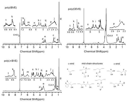 The terminal structures of poly(IBVE), poly(CEVE), and poly(n-BVE) obtained in aqueous suspensions and emulsions were examined by 1H-NMR spectroscopy (Figure 8). The characteristic signals at 0.90 (peak g), 1.60 (peak f), 1.79 (peak c), 3.17 (peak e), and 3.56 (peak d) ppm were assigned to the main chain protons of the monomer unit of poly(IBVE). The characteristic signals at 1.00–2.09 (peak c) and 3.4–4.00 (peaks d, e, s) ppm were assigned to the main chain protons of the monomer unit of poly(CEVE). The characteristic signals at 0.90 (peak g), 1.10–1.75 (peaks c, u, v), and 3.25–4.00 (peaks d, e) ppm were assigned to the main chain protons of the monomer unit of poly(n-BVE). The signals at 1.11 (peak a) and 7.00–7.20 (peak b) ppm were assigned to –CH3 and the phenyl group at the α-end (Figure 8), respectively. The signals at 2.52 (peak j), 5.35 (peak i), and 5.60 (peak h) ppm were attributed to the mid-chain (internal) olefin group formed due to chain transfer to the polymer [22]. In addition, the following three types of ω-end groups were examined in the 1H-NMR spectra (Figure 8): acetal (resonance at 4.73 ppm (peak q)), aldehyde (resonances at 2.49 (peak p), and 9.81 (peak t) ppm, respectively) and alkenal (resonances at 6.09 (peak n), 6.90 (peak m), and 9.54 (peak k) ppm, respectively).