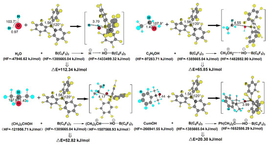 The optimized conformations of H+–B(C6F5)3–OH−, CH3CH2+–B(C6F5)3–OH−, (CH3)2CH+–B(C6F5)3–OH− and (CH3)2C(C6H5)+–B(C6F5)3–OH− at the 6-31G* level.