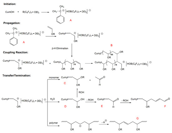 According to the experimental data, a mechanism for the aqueous cationic polymerization of vinyl ether was proposed (Scheme 1). In the initiation, B(C6F5)3/Et2O captured a hydroxyl group from CumOH to form the (CH3)2C(C6H5)+–Et2OB(C6F5)3–OH− active center (structure A). The structure A then initiated the polymerization, and the propagation was extremely fast until chain-transfer reactions or termination occurred. The chain-transfers via β-H elimination formed a terminal double-bond group that was highly reactive [37,50]. This terminal olefin group readily reacted with structure A, thereby forming coupled chains that resulted in polymers with two head groups (structure B) [35,51]. The chain-transfers by the monomer generated an acetal end group (structure C) [22]. The chain-transfers by water generated an hydroxyl end group (structure D), but the low stability of hemiacetal for poly(vinyl ether)s led to hydroxyl end group (structure D) conversion into an aldehyde end group (structure E) or acetal end group (structure C). The aldehyde end group lost ROH to form an alkenal end group (structure F) [37]. In addition, only trace amounts (Table 3) of mid-chain olefin groups (structure G) were detected in the aqueous polymerization due to chain-transfer to the polymer [35], which was a typical side reaction in the conventional cationic polymerization of vinyl ethers.