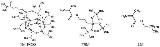 The aim of the work was to investigate the possible anchoring effect exerted by the POSS cage on the polymerization kinetics of the UV-initiated process. The model system consisted of a monomethacryloxy substituted POSS (methacryloxypropyl-heptaisobutyl POSS, denoted as 1M-POSS) and lauryl methacrylate (LM, the only popular and non-volatile methacrylate monomer miscible with 1M-POSS) at various comonomers ratios. The investigated system is linear; therefore, its polymerization kinetics will not be complicated by crosslinking effects. For comparison, also another methacrylate having a large volume substituent (corresponding to an open part of the POSS cage, which may also serve as an anchor) was investigated, namely 3-[tris(trimethylsiloxy)silyl]propyl methacrylate (TSM) (Figure 1). This provides better insight into the possible “anchor effect”. The polymerization was initiated photochemically, which enables precise control of the reaction (the initiator derived radicals begin to form when the light is switched on and their formation is stopped at the break of irradiation; the polymerization occurs only in the irradiated area [20]).