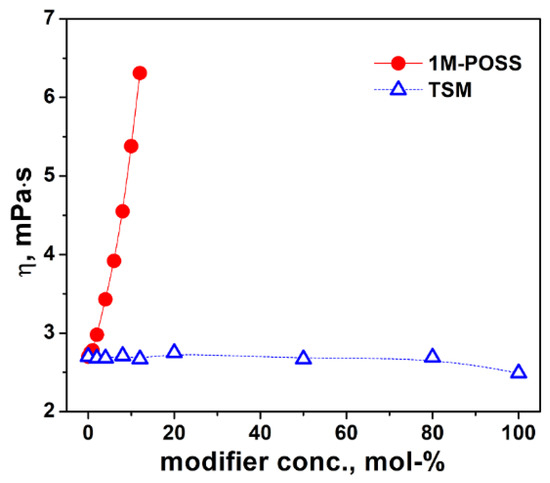 The dependence of the viscosity on the modifier content for the two systems (LM/1M-POSS and LM/TSM) is given in Figure 2. The viscosity of the LM/1M-POSS system rapidly increases with the 1M-POSS content, indicating the existence of strong interactions between the POSS-cages (not yet tethered to the polymer chain) and the LM monomer.