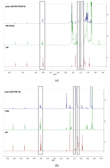 In Figure 3, the 1H NMR stacked spectra disclose the correlations between the 1H NMR spectra of LM, 1M-POSS, and their copolymer (Figure 3a) and LM, TSM, and their copolymer (Figure 3b). The resonance lines originating to specific types of groups of both comonomers are visible. There are new signals arising from the -CH2- (polymer chain) at 1.63 ppm (wide resonance line) and 1.35 ppm, along with the changes in the region between 4.10–4.00 ppm that is assigned to the -OCH2- groups deriving from the copolymer and monomers. The surrounding -OCH2- chemical is slightly changed in the fragments derived from LM and 1M-POSS. This region is the most susceptible to changes and they are obviously more noticeable with the rising 1M-POSS content in the copolymer. In the case of the TSM-containing copolymer, there is a resemblance in the matter of the -OCH2- moiety and new signals arising from the -CH2- fragments.