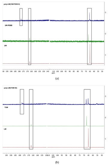 13C NMR stacked spectra of the LM monomer, the modifiers, and the copolymers containing (a) 8 mol % of 1-M POSS, (b) 50 mol % of TSM.
