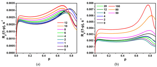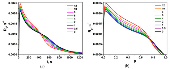 As mentioned above, the gel effect in LM-based formulations is poorly marked. We can observe it better on the plots showing the dependence of the concentration of radicals on the conversion degree. The polymerization rate is expressed by Equation (4):