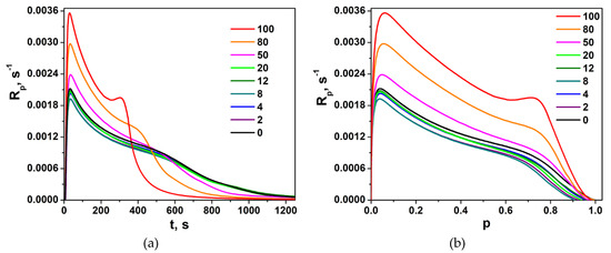 The homopolymerization of neat LM (as other methacrylates with a longer ester group) occurs, with a poorly marked gel effect appearing at higher conversions [25]). Consequently, the polymerization rate at the maximum of this effect is much lower than at the beginning of the polymerization, in contrast to short-chain methacrylates, such as methyl methacrylate MMA (e.g., [26]), butyl methacrylate, or 2-hydroxyethyl methacrylate [7]. Therefore, in our case, the maximum polymerization rate, Rpmax, is defined as the highest reaction rate, not the rate at the maximum of the gel effect.