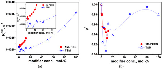 A more detailed analysis of Figure 5 and Figure 6 indicates, however, that the increase in the polymerization rate in the presence of the modifiers does not occur in the whole range of their concentrations. Figure 7a presents Rpmax values as functions of the content of the Si-containing monomers. It is clearly visible that the addition of their small amounts slows down the reaction. This effect is well observable in the case of LM/TSM compositions; the lowest Rpmax value appears at a TSM concentration about 8 mol %; at higher concentrations, the polymerization rate begins to increase. For the LM/1M-POSS system, the clear minimum is not visible due to the scattering of the data and only a kind of a plateau up to 2 mol % of 1M-POSS content can be observed (the minimum appears at 1 mol % of the 1M-POSS content as can be found from rheological studies, see Section 3.3.2). This tendency is reflected also by the behavior of the final conversion of double bonds, pf, Figure 7b (the determination of pf is always subject to a greater error, hence the considerable scatter of points). Further discussion of these phenomena first requires consideration of the behavior of the gel effect.