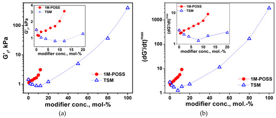 However, the derivative of the modulus with respect to time, dG’/dt, corresponds to the polymerization rate, and its changes over time reflect changes in the reaction rate. Thus, the maximum value of the derivative, (dG’/dt) max, corresponds to the maximum polymerization rate (at the inflection point of the curves in Figure S2). Figure 9b presents the (dG’/dt) max dependence on the 1M-POSS and TSM contents. The plot of the function, (dG’/dt) max = f (modifier conc.), exactly corresponds to the behavior of the Rpmax values determined by the DSC method (compared with Figure 7a). Due to the greater accuracy of the photorheological measurement, the minima on the plots are clearly visible at 1 and 8 wt % of 1M-POSS and TSM, respectively.
