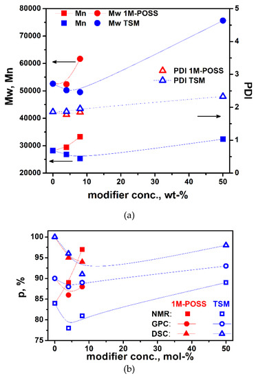 The results of GPC analysis (number average, Mn, and weight average, Mw, molecular weights, polydyspersity index, PDI, and fraction contents) of selected copolymerization products containing 4 and 8 mol % of 1M-POSS or 4, 8, and 50 mol % of TSM are given in Table S2. The dependence of the copolymer molecular weight (MW) and polydispersity index, PDI, on the modifier content is shown in Figure 11a. Interestingly, the plots show minima, analogously to the results obtained from the kinetic measurements. This seems to confirm the previous assumption that at low concentrations of the modifiers, the termination increases, while at higher contents, the anchor effect promotes chain elongation.