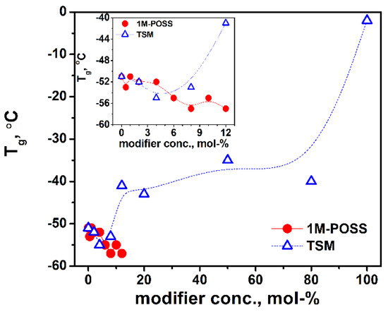 The Tg behavior of TSM-containing copolymers was similar to the behavior of the polymerization rate (a minimum in the plot of Tg vs. the modifier content), resulting from the influence of TSM on polymer chain mobility. In the case of 1M-POSS, only a plasticizing effect was observed.