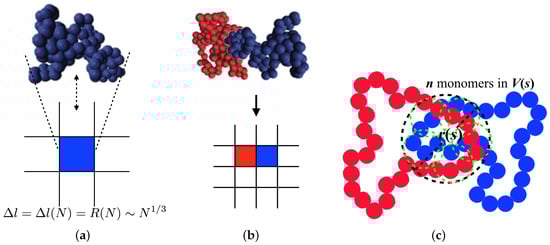 To implement the threading into the model described above, we introduce a coarse-grained lattice model (Figure 1a,b). On a square lattice, each ring polymer is represented by an individual lattice site. We deal with the ring polymers whose lengths are longer than based on the idea that, as the longer the length of the ring is, the more the threading configuration affects its dynamics. We implicitly incorporate N and the relaxation time scale of the non-threading ring of the length N into the lattice constant and a Monte Carlo step. At first, we should express a lattice constant, , in terms of N to see N-dependent dynamic properties of ring polymers. Obviously, since a ring occupies one lattice site. In the annealed tree model, a ring of shows a size scaled as , thus the lattice constant is given by: