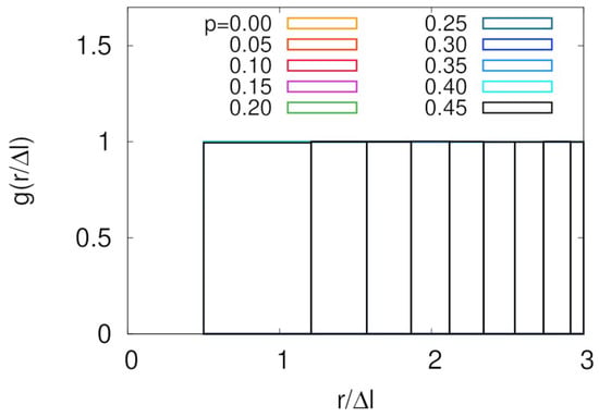 Radial distribution functions for different threading probabilities shown in different colors. All graphs with different ps overlap with each other.