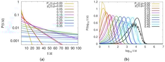 Decoupling of persistence (, solid lines) and exchange (, dashed lines) time distributions for molecular contacts: (a) a linear-log plot that clearly shows an exponential decay of both and for ; and (b) versus showing that, the larger is p, the more clearly shown is the decoupling of two distributions. Different colors represent different average threading probabilities, p.