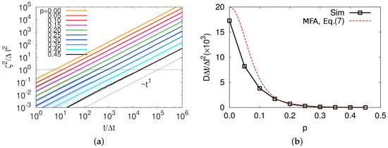 For both diffusion coefficients and diffusion times, while their scaling dependence on N for small value of N was in a good agreement with mean-field predictions, the system became much slower than expected from the theory as p approaches to 0.5. We found that Equation (6) well describes the local mobility by observing a time correlation function of the particle immobility, as shown in Figure 6. The correlation function is defined by where indicates an ensemble average. The correlation times for the particle immobility, , obtained by integrating the correlation function, indicates how long the immobility of the particle persists over time. Figure 6b shows that calculated s from simulations were almost identical to those expected from the mean-field approach,