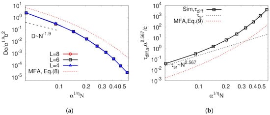 As mentioned above, it is very important to keep in mind that all unit time, unit length, and threading probability are functions of N, which allowed representing the diffusion coefficients as a function N as well as finding scaling relations that have been usually studied in polymer physics. Using the relations in Equations (1), (2), and (5), we can rewrite Equations (7) and (6) such that: