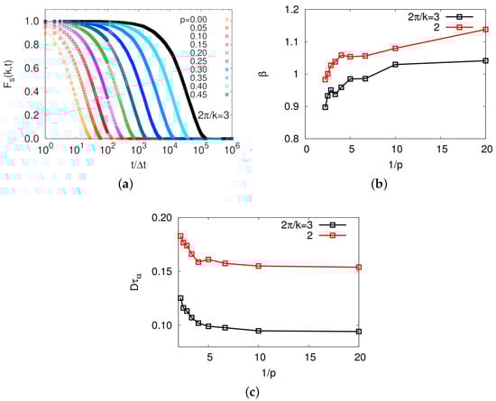 (a) Self-part of intermediate scattering functions with for different values of ps; (b) exponents of the fitted stretched exponential functions of intermediate scattering functions; and (c) as a function of . Black and red lines indicate results with and , respectively. In (b,c), decreasing exponent and increasing with increasing p are shown, which is strong evidence for heterogeneous dynamics.