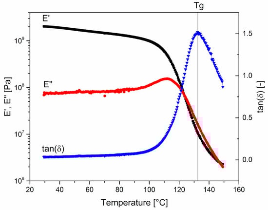 Figure 1 reports the temperature dependence of the conservative and dissipative components of the dynamic modulus, E’ and E’’ respectively, and of the loss factor, tan(δ) = E’’/E’. The glass transition temperature (Tg) is defined as the temperature at which tan(δ) reaches its maximum value.