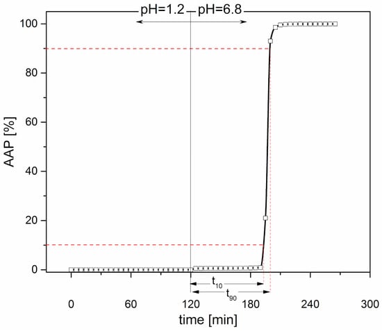Release performance-Capsule bodies were manually filled with approximately 80 mg of AAP (CV ≤ 2%) and then closed with matching caps. The compendial test for gastroresistant dosage forms (Dissolution Test for Delayed-Release Dosage Forms-Method B, USP38) was performed in apparatus 2 (Dissolution System 2100B, Distek, North Brunswick Township, NJ, USA; n = 3) at 100 rpm and 37 ± 0.5 °C. The devices were maintained in hydrochloric acid buffer pH 1.2 for 2 h, to simulate the gastric environment, and then transferred into phosphate buffer pH 6.8, to mimic the pH change after stomach emptying. Gastroresistant dosage forms are required to remain intact in the former stage of the test and release their drug content during the latter. Fluid samples were automatically withdrawn by a peristaltic pump every 5 min and the amount of drug released was assayed spectrophotometrically (cuvette with 1 mm optical path length; λ = 245 nm). Capsules were able to withstand the acidic medium (pH 1.2) for 2 h, whereas in the pH 6.8 buffer, there was a lag time prior to the break-up and release of the tracer. These results were in agreement with the behavior of traditional gastroresistant reservoir systems obtained by film coating and characterized by release-controlling layers of hundred microns in thickness [,]. The in vitro lag time was expressed as the time required for 10% drug release in phosphate buffer (t10%). It was calculated by subtracting 120 min (i.e., the time during which the devices were kept in pH 1.2 fluid) from the time obtained by linear interpolation of the experimental data immediately before and after this release percentage. By analogously calculating t90% and subtracting t10% from the resulting value, an index of the time needed for the complete release of the tracer was obtained (t90% − t10%). By way of example, the release profile of a 25-PEG1.5-based capsular device is reported in Figure 3.