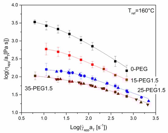 Steady-state apparent shear viscosity, ηapp, versus apparent shear rate at die wall, app,w, for 0-PEG, 15-PEG1.5, 25-PEG1.5, 35-PEG1.5 from capillary rheometry tests at: 160 °C (■), 155 °C (●), 150 °C (▲), 140 °C (▼). The reference temperature for 25-PEG1.5 and 35-PEG1.5 master curves is 160 °C. Lines represent the fitting with Cross equation (Equation (2)).