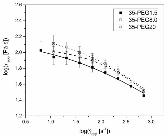 Steady-state apparent shear viscosity, ηapp, versus apparent shear rate at die wall, , at 160 °C for 35-PEG1.5, 35-PEG8.0 and 35-PEG20. Lines represent the fitting with Cross equation (Equation (2)).