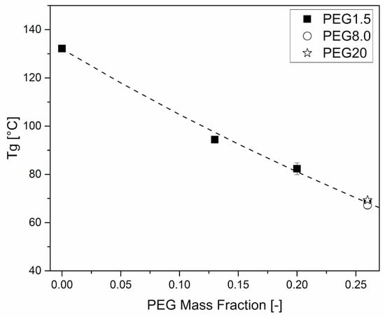 The dependence of Tg on temperature could be effectively fitted using the Fox equation, Equation (3):