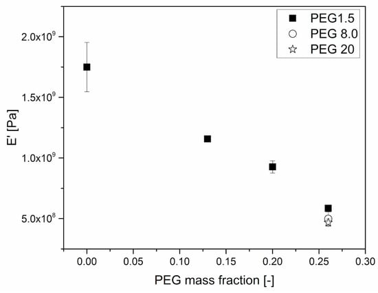 The conservative component of the complex modulus (E’) seems to depend linearly on PEG weight fraction, at least in the considered range of compositions. The dependence is however stronger than could be expected from a simple rule of mixtures, and this is probably also due to the reduction of Tg induced by PEG.