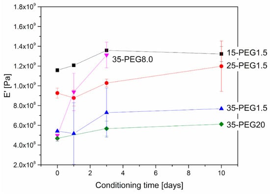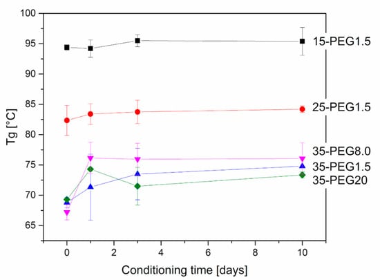 Further, DMA allowed investigation of the stability of material properties over time. As reported in Figure 8 and Figure 9, at increasing conditioning times at 40 °C, both Tg and the moduli increased, which can be related to the release of PEG from HPMCAS. This is particularly evident at higher PEG concentrations. The effect of molar mass is in this case marked: the increase in both Tg and E’ was higher for PEG8.0 and PEG1.5, and more limited for PEG20.