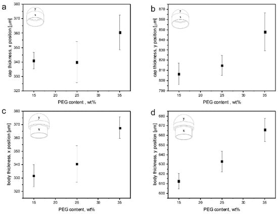 Average thickness values, with relevant sd, resulting from measurements performed on thin and thick sections of caps (a,b) and bodies (c,d) obtained from15-PEG1.5, 25-PEG1.5 and 35-PEG1.5 formulations.