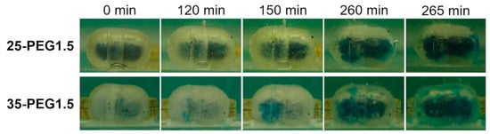 25-PEG1.5 and 35-PEG1.5-based capsular devices filled with a dye-containing formulation at different time points during immersion in unstirred pH 6.8 buffer. Break-up was highlighted by the presence of blue coloration outside the shell after 260 min.