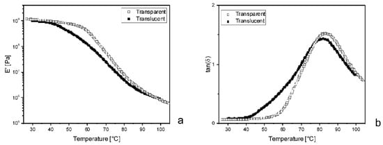 Comparison between the dynamical mechanical responses of 25-PEG1.5 either maintained in an oven at 40 °C, indicated as “Transparent”, or at room temperature, indicated as “Translucent”. (a) Conservative component of the complex modulus, E’, versus temperature; (b) Loss factor, tan(δ) versus temperature.