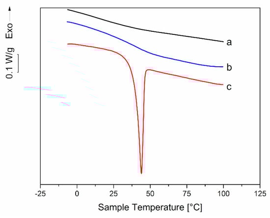 Comparison between the DSC thermograms of dynamical mechanical responses of (a) a 35-PEG1.5 extruded bar immediately after extrusion; (b) the inner, transparent region of a 35-PEG1.5 bar maintained at room temperature for 2 months after extrusion; (c) the external thin opaque layer of a 35-PEG1.5 bar maintained at room temperature for 2 months after extrusion.
