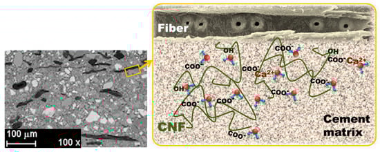 Physical bonding occurs during the hydration of cement when crystals interlock with each other and the fiber surfaces and grow into any other openings and permeable parts of the fiber. Several studies have proved that the hydrophilic and hygroscopic features of CNF can provide a sort of internal water reservoir in the nanofibril network (Figure 2), with a higher concentration of Ca2+ ions electrostatically attracted by the anionic nanofibril surface [76,77,78,79,100]. Furthermore, the diffusion of water molecules in the nanofibril network is easier and faster than that in the matrix [84]. These two facts accelerate the production of calcium silicate hydrate (CSH) gel during hydration at the fiber–matrix interface. This causes the accumulation of hydration products at the interface and increases physical bonding between fibers and the matrix, thus improving the mechanical properties and preventing pull out, as proved by means of EDX analysis of elemental compositions in the fiber surface [93] and by X-ray diffraction and FTIR of the composites [76]. The accelerated carbonation curing contributes to the densification of the matrix and increases the dynamic modulus of elasticity [81] and the compressive strength [76].