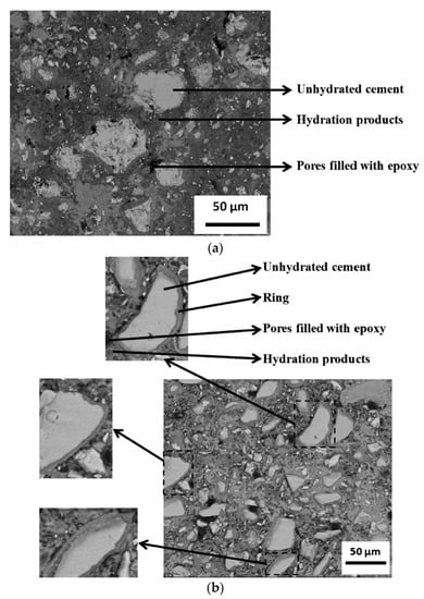 Backscattered scanning electron (BSE-SEM) microscope images of hardened pastes with (a) 0% CNC and (b) CNC/cement (vol.%) = 1.5 (≈0.77 wt.% CNC) at the age of 7 days. Reprinted from [84] with permission. Copyright Elsevier, 2014.