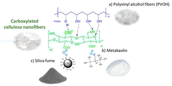 Potential interactions between carboxylated CNF and the different components of the C-FCC matrix, such as (a) polyvynil alcohol fibers (PVOH); (b) metakaolin; and (c) silica fume.